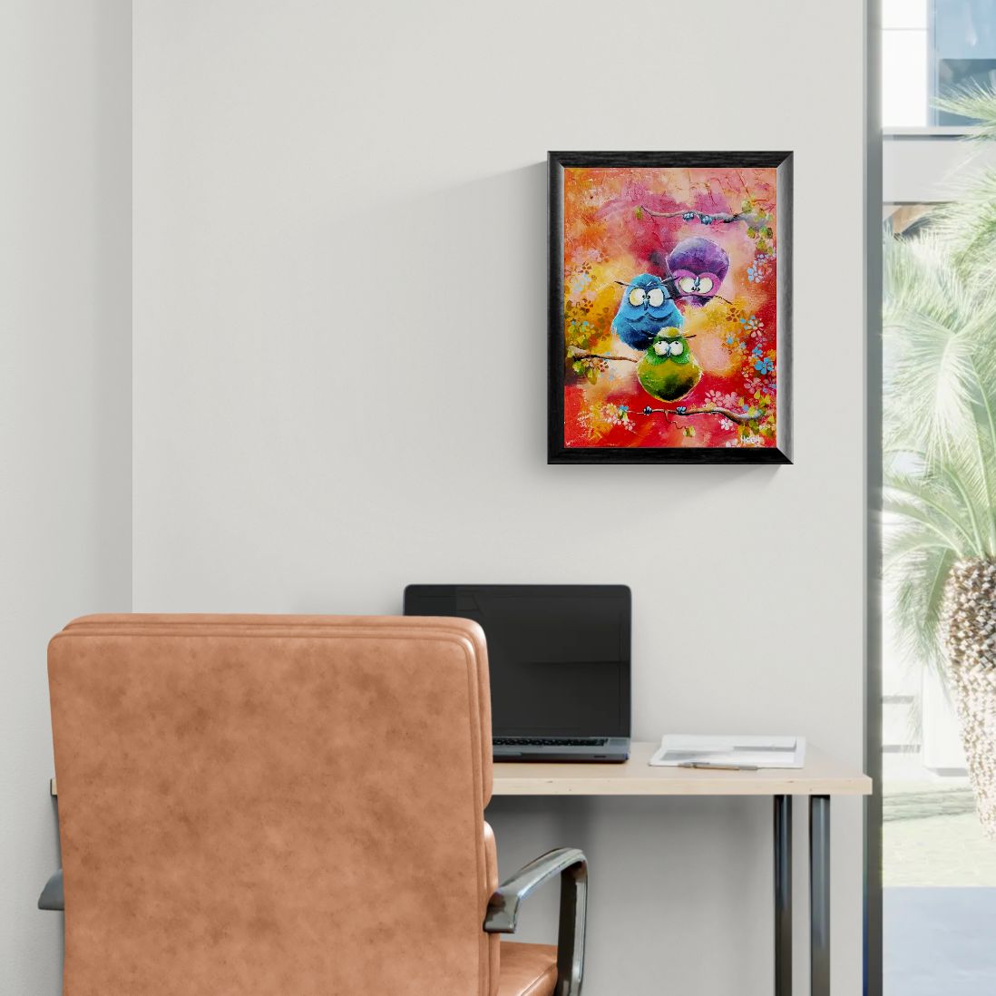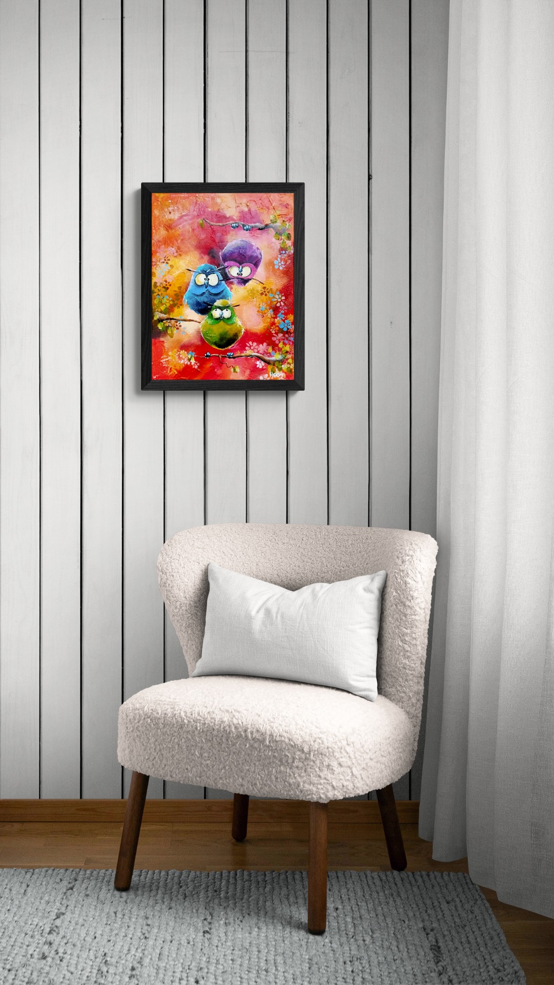 Denne lille perle af et maleri fortjener en hædersplads, hvor du kan nyde maleriet hver eneste dag. Farverne er utroligt smukke og livlige. Titlen er "Fodfejl og fadæser" og de tre uglers udtryk taler for sig selv. Et vellykket maleri på 40x30 cm. Kan sendes med GLS.