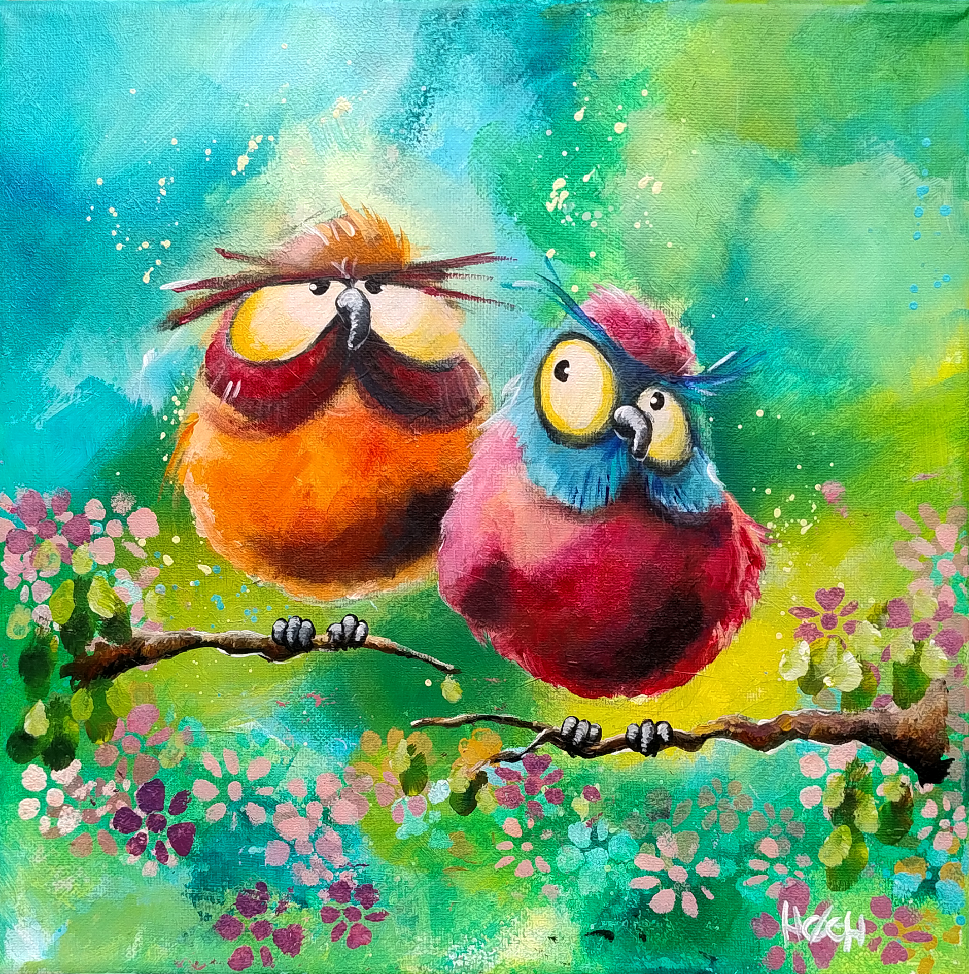 Maleriet er holdt i blå-grønne farver og de to berømtheder i varme nuancer og udstråler med med sine 30x30cm. saft og kraft nok til at indtage en central placering i dit hjem. Det kan sendes med GSL og der følger en smagfuld sort ramme med maleriet.