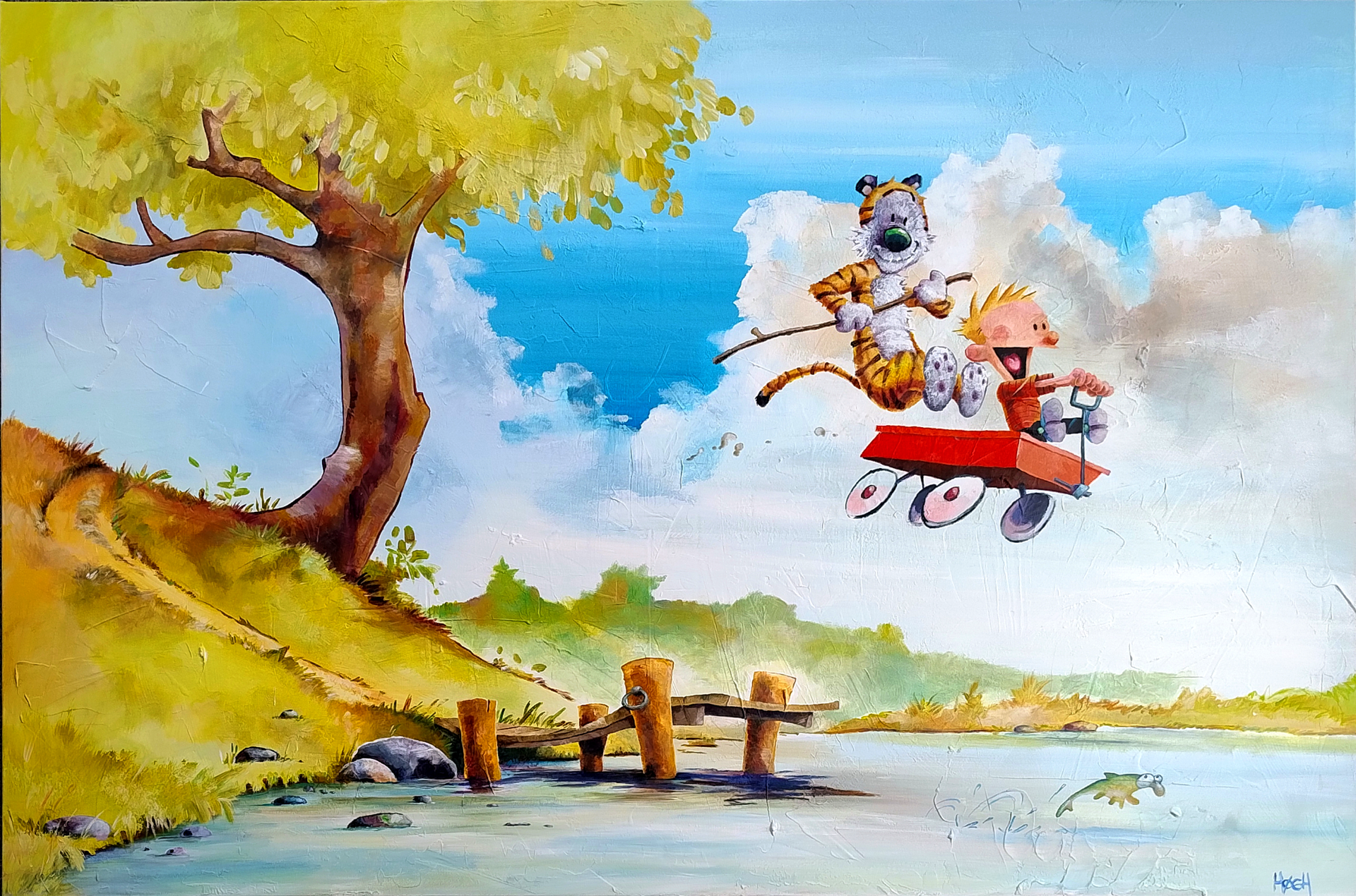 Er du på udkig efter et hovedværk med Steen & Stoffer, så skal du slå til nu: Svend har endnu en skabt skabt et mesterværk med det klassiske legevognmotiv. Målene er bredformatet 150x100 cm. og værket vil kunne indtage kongepladsen i din opholdsstue. Værket er fyldt med liv og hvert eneste penselstrøg er sat med indføling og liv. Farverne er glade og stemningsfyldte og du kan bruge mange timer med at gå på opdagelse i detaljerne.