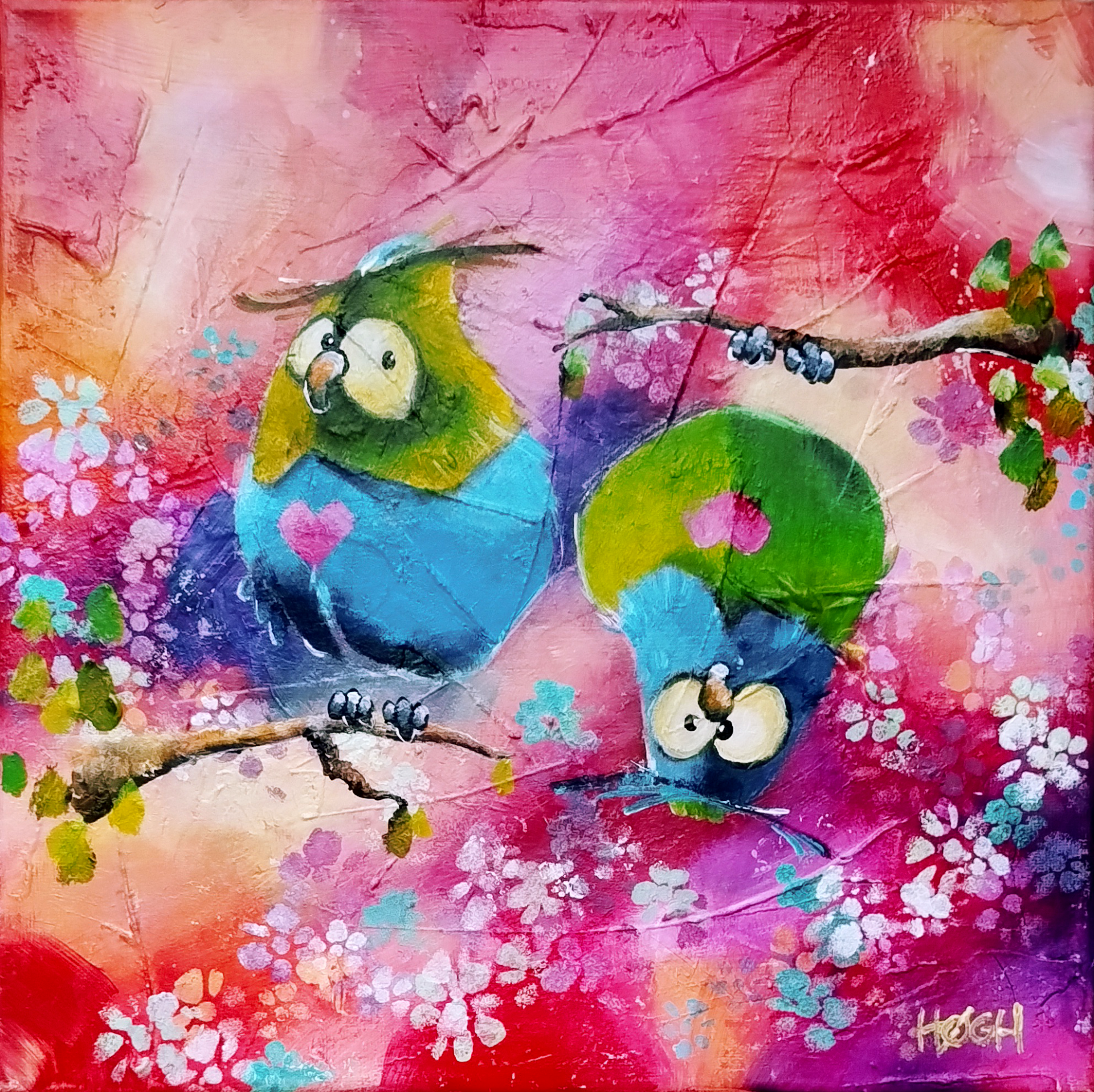 To dejlige ugler med hjertet på det rette sted. Farverne står knivskarpt og bringer liv til din væg. Maleriet måler 30x30 cm. og maleriet er monteret i sort ramme. Dette skønne værk kan sendes med GLS.
