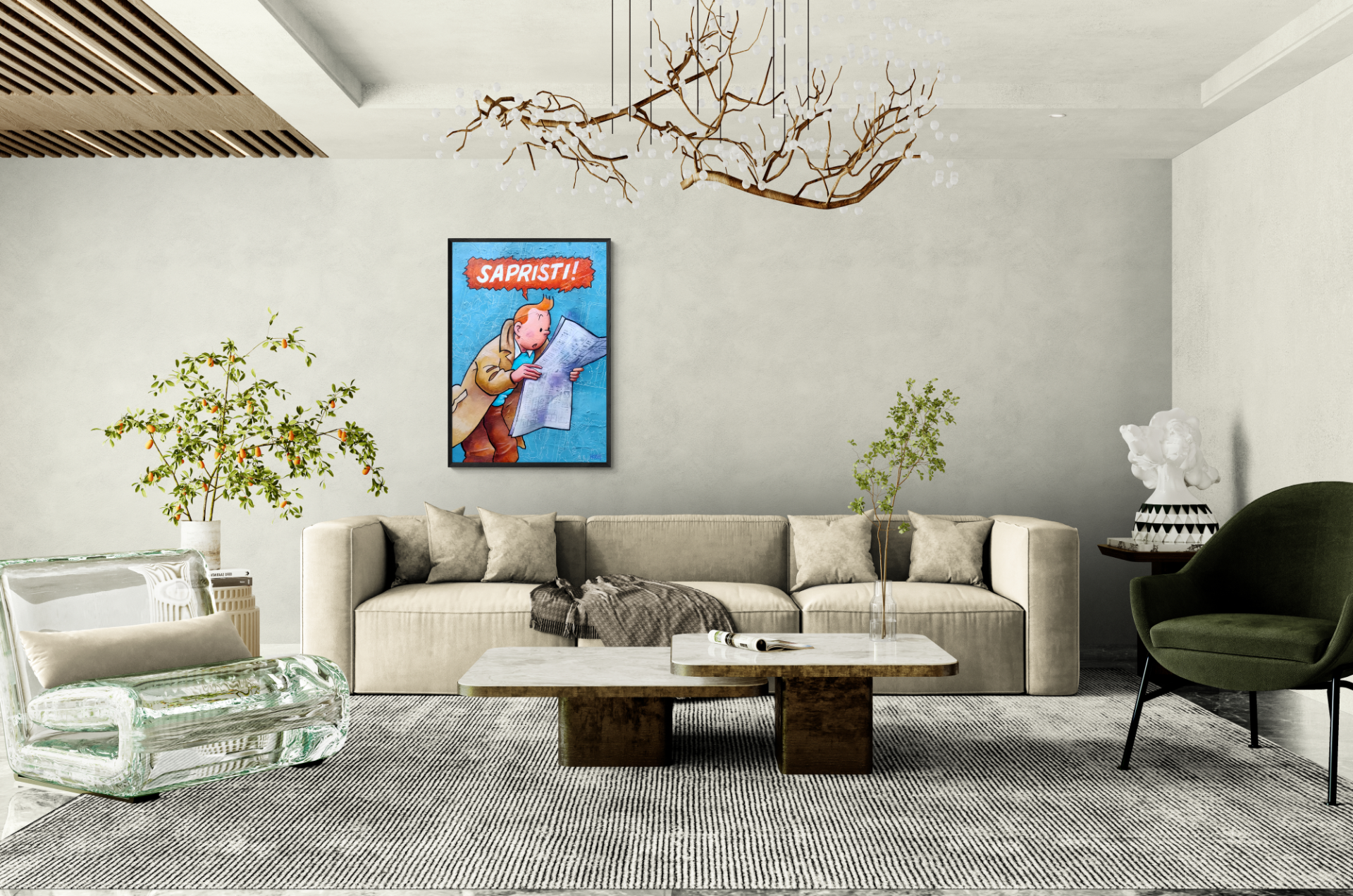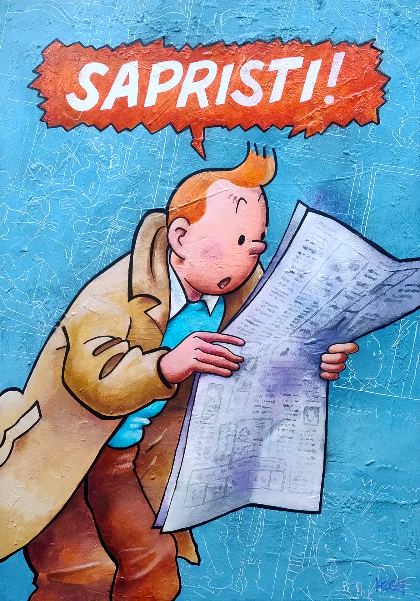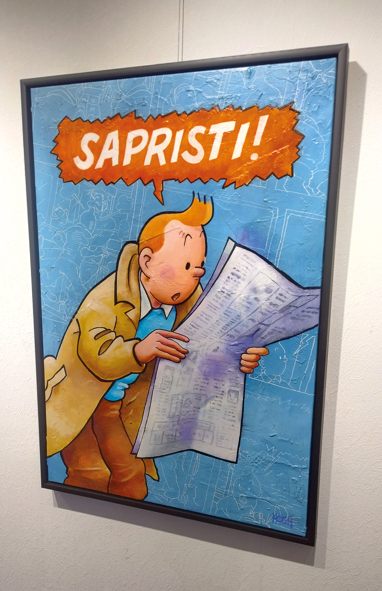 Her er du muligheden for at udsmykke din væg med et helt unik Tintin-maleri. Maleriet er et vidnesbyrd om Svends talent, for han fanger både det naviistiske udtryk i Hergés figur samt beviser at han behersker detaljer. Seriensiden i maleriet baggrund er en serieside fra "Koks i lasten" tegnet op i hånden.